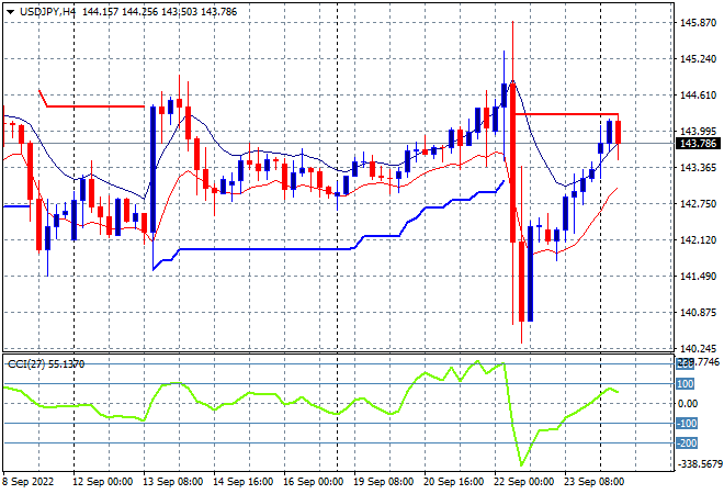 Mainland Chinese share markets are heading lower as we start a new trading week with the Shanghai Composite down 1.2% to 3051 points while the Hang Seng Index is still being crushed, down 0.7% at 17810 points. Japanese stock markets are the biggest losers with the Nikkei 225 closing some 2.6% lower at 26431 points while the USDJPY pair is trending higher as the USD gets stronger and stronger, now almost back to its previous weekly high just below the 144 handle: