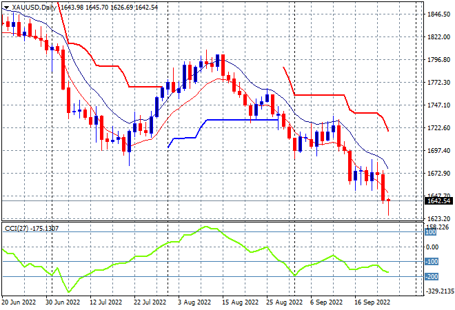 Asian stocks start the new trading week in bear market mode, with risk sentiment remaining in defensive positions as recession fears mount amid rising interest rates. The USD is building strength against the major currencies, while oil prices are continuing their drops from Friday night with Brent crude falling below the $85USD per barrel level while gold has also been depressed, still crushed below former support at the $1700USD per ounce level, currently at $1642: