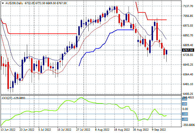 Australian stocks were looking very unsteady with the ASX200 finishing some 0.3% lower at 6719 points. SPI futures are indicating at least a 0.8% gain on the open in line with Wall Street’s lift from overnight with the daily chart showing similar price action to other Asia stock markets. Price is below the August lows as daily momentum has switched to full oversold mode, but the long tail of buying support is indicative that key support at the 6700 will be tested next: