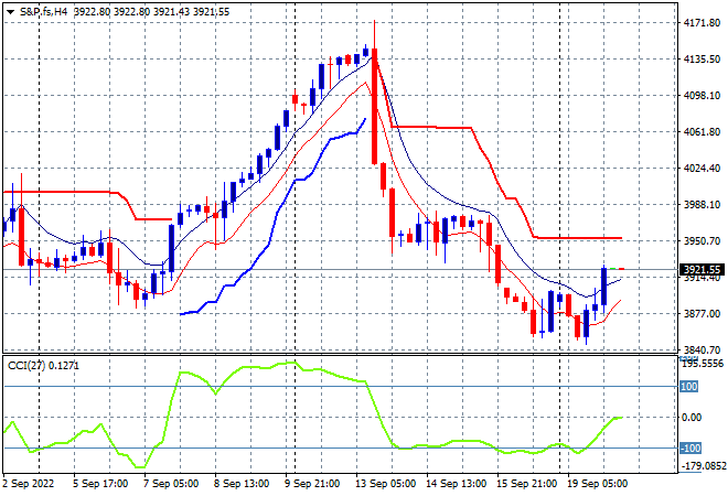 Wall Street finally found some confidence or more likely short covering in the wake of the recent steep falls, with the NASDAQ up nearly 0.8% while the S&P500 finished 0.7% higher at 3899 points. The four hourly chart is showing a potential swing play here above the 3900 point level, with short term resistance at the 3950 point level equating with overhead ATR resistance the area to beat as momentum retraces from being sharply negative: