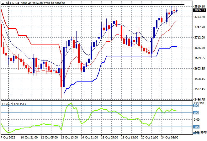 Eurostoxx and US futures are again drifting sideways as we head into the London session, with the S&P500 four hourly futures chart showing price action pausing at the 3800 area after the big surge on Friday night, still failing to get back above monthly resistance (upper black horizontal line). Medium term and possibly psychological long term resistance at the 4000 point level is a distant memory, but this does set up another attempt as short term momentum remains overbought: