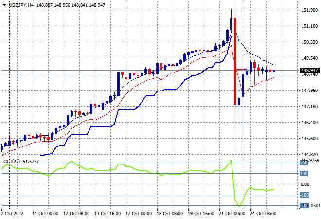 Mainland Chinese share markets have stabilised somewhat with the Shanghai Composite getting back above the 3000 point barrier with a 0.2% lift while the Hang Seng Index is sliding down into the red, currently off 0.1% and still well below the 16000 point level, currently at 15167 points. Japanese stock markets are standing out from the crowd with the Nikkei 225 closing 1% higher to 27265 points, while the USDJPY pair is still trying to stabilise after its epic volatile session on Friday night, just below the 149 level: