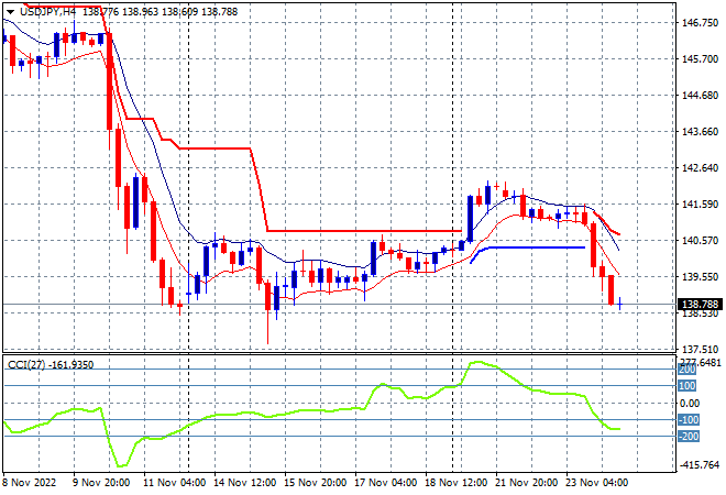 Asian stock markets are broadly positive in response to the continued bounceback on Wall Street overnight with traders trying to look through the US Thanksgiving and Black Friday shenanigans. The USD remains weak against the currency majors from overnight where a softer than expected PMI print saw Euro and others surge against King Dollar, the former pushing up through the 1.03 level while the Australian dollar has extended its gains above the 67 handle. Oil prices remain depressed with Brent crude holding on just below the $85USD per barrel level while gold is playing catchup after falling behind the other undollars overnight, now pushing higher at the $1755USD per ounce level: