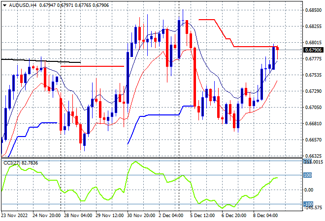 Asian stock markets are all responding positively to the inversion in risk sentiment on Wall Street overnight, putting aside concerns over global recession fears and higher inflation. The USD is pulling back sharply against most of the major currency pairs with the Australian dollar on its way to the 68 cent level. Oil prices are still depressed with Brent crude still slumped below the $76USD per barrel level while gold is working hard to fill in it start of week selloff, now in sight of the $1800USD per ounce level: