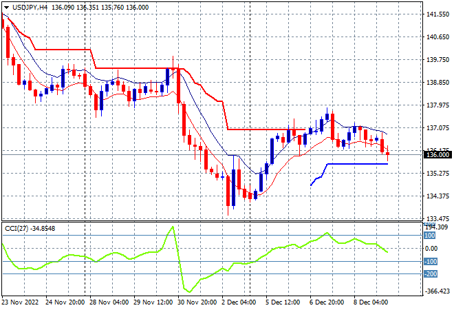 Mainland Chinese share markets are meandering around post the inflation print again struggling to convert into a positive finish with the Shanghai Composite right on the 3200 point level while the Hang Seng Index has lifted again following yesterday’s news that the HK government may ease COVID restrictions, gaining more than 1% to 19769 points. Japanese stock markets are playing catchup finally, with the Nikkei 225 finishing more than 1% higher at 27910 points while the USDJPY pair has been unable to get back above short term resistance at the 137 level , now depressed back down to the 136 handle proper: