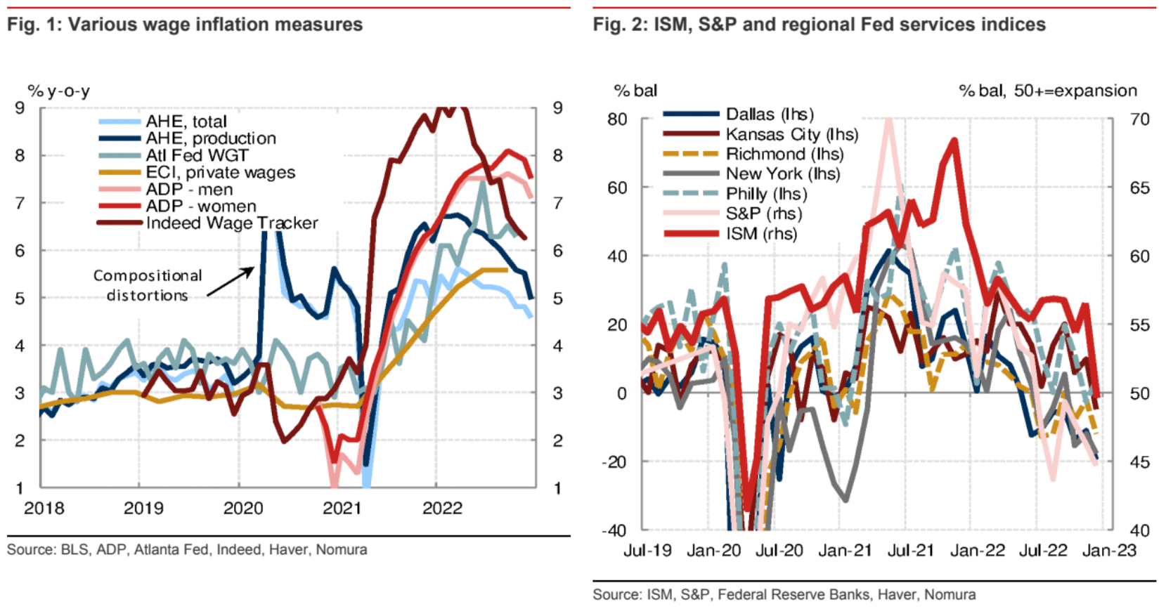 Outside of labor markets, economic data continues to rapidly soften. The December ISM services index fell into contractionary territory for the first time since May 2020, after being out of sync with consistently weak related indicators such as regional Fed business surveys and S&P service PMIs (Fig. 2). The sub-50 reading of the ISM service index supports our long-held view that a recession likely commenced in Q4. Factory orders surprised to the downside, falling 1.8% m-o-m in November in addition to being revised downward from to -0.4 from +0.4 in October, while December ISM manufacturing went deeper into contraction territory to 48.4, consistent with our view that the manufacturing sector has been in a recession for some time, along with the housing sector. On balance, we believe incoming data is consistent with the US economy entering or having already entered a recession, which combined with falling price and wage inflation, supports our call for terminal rate of 4.875% to be reached March 2023.