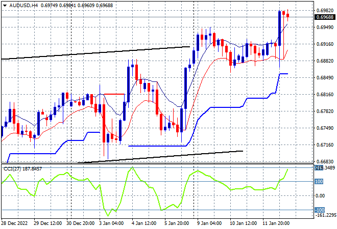 Wall Street bounced around overnight on the CPI print with the NASDAQ eventually closing up 0.6% while the S&P500 gained only 0.3% to close at 3983 points. After breaking the series of lower daily highs since Xmas, price action is pushing further above the dominant medium term trendline after hovering around weekly support at the 3800 point level, and its now punching through the December highs. The inability to decisively push through the 4000 point barrier after the inflation print is a bit telling however:
