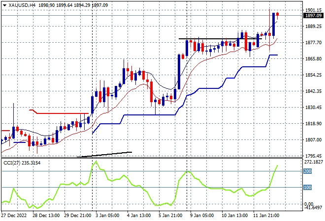 Wall Street responded relatively calmly to the latest US inflation data which showed a retraction mainly due to energy prices which now embiggens risk markets to assume the US Federal Reserve will ease off on its rate rise agenda. The USD was hit hard as a result with Euro surging while the Australian dollar pushed up towards the 70 cent level. Bond markets saw yields drop with 10-year Treasury yields pushed down to the 3.4% level while the commodity complex saw oil prices lift again as Brent crude almost pushed through the $84USD per barrel level while gold nearly broke through to the $1900USD per ounce level.