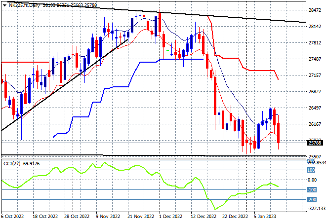 Japanese stock markets however pulled back sharply as the BOJ tried to shore up the bond market amid a much stronger Yen with the Nikkei 225 closing 1.2% lower at 26119 points. There was the potential for a swing long trade to develop further here after bottoming out at the 25000 point level but it failed after only one close above the high moving average with a return to the recent lows on the stronger Yen trade. Daily momentum never went positive with futures indicating a mixed open to start the trading week on a very cautious note: