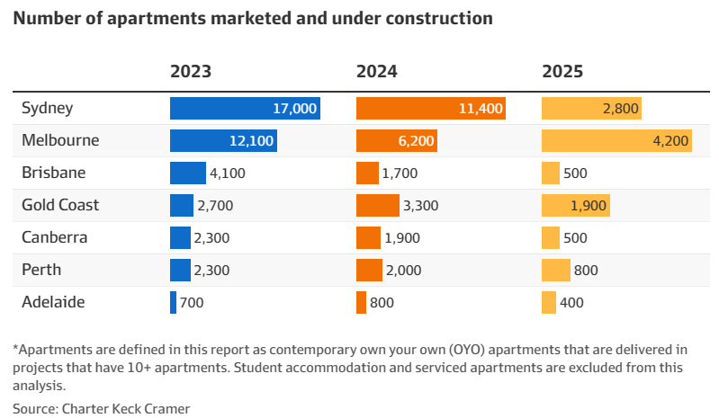 Now, Charter Keck Kramer estimates that around 41,200 apartments are under construction and being marketed across Australia’s capital cities in 2023.
