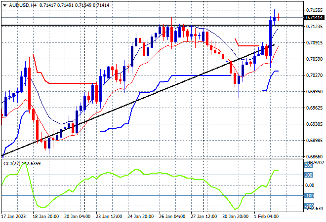 Asian stock markets are reacting well to the overnight moves following the Federal Reserves latest meeting where post the 25 basis point rise, dovish talk about future rate cuts lifted risk spirits everywhere. Currency markets are holding on to their gains against USD with Euro pushing up through the 1.10 handle while the Australian dollar is likewise bullish above the 71 cent level. Meanwhile oil prices are going nowhere as the OPEC+ meeting gets underway with Brent crude about to cross below the $83USD per barrel level as gold also consolidates its big move above the $1950USD per ounce level: