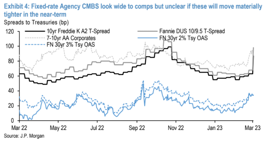 Where we go from here is uncertain, but spreads can remain wide. As our Agency MBS colleagues note(seeAgency MBS), mortgages can remain wide as money managers will remain the marginal buyer. Large banks that are gaining deposits may wait until they better understand duration needs against their new deposits before deploying cash. Recall that our Agency MBS colleagues expected banks to return to being net buyers of MBS securities this year but after recent events, this could take a while longer. If mortgage spreads are expected to remain wide, CMBS spreads will remain wide as well. Agency CMBS looks wide relative to lower coupon mortgages and similar duration AAcorporates (Exhibit 4) but it’s unclear that these will move much tighter in the near-term. IG mezz remains susceptible to further widening as fundamental concerns weigh heavy, and liquidity has been sucked out of the market. At some point IG mezz bonds will be good buys, but a lot of uncertainty remains.