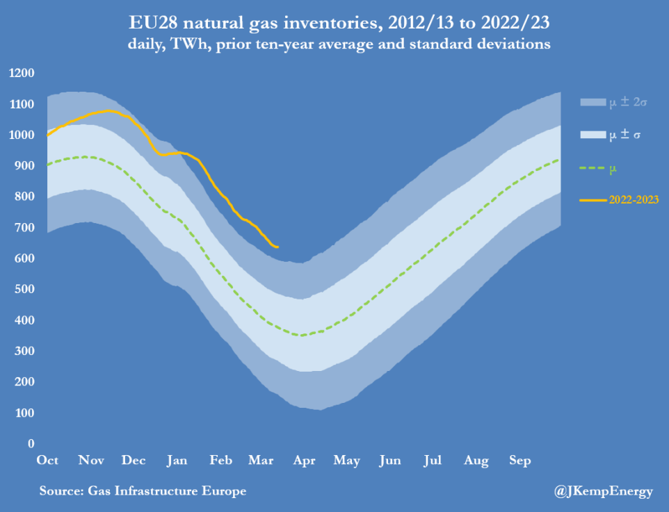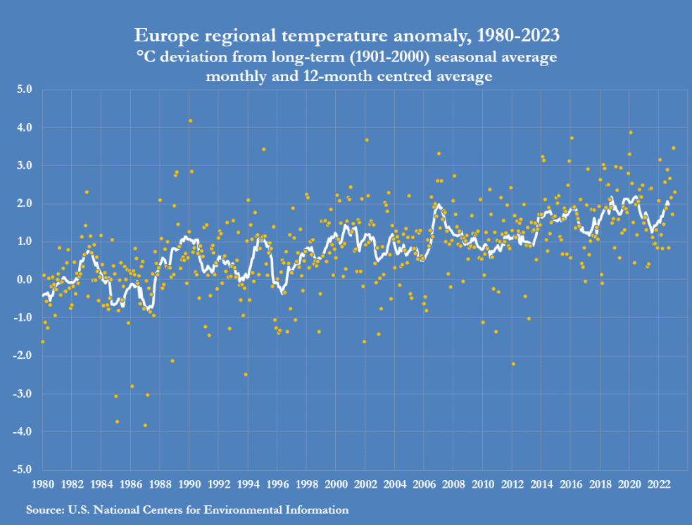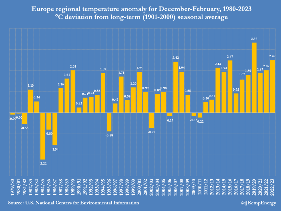 A remarkably warm winter in Europe that is part of a decisive trend. Charts from John Kemp.