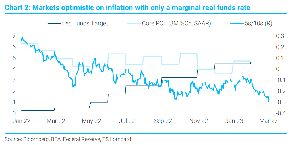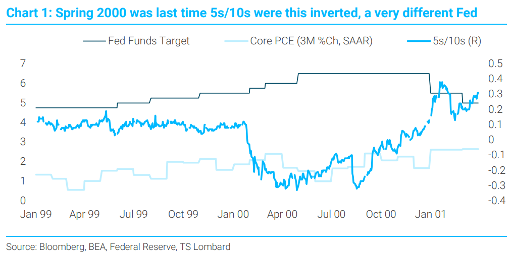 There is an unwavering belief among many traders, investors, economists, policymakers and the like that inflation returns to 2% by matter of divine right. No recession needed or even probable. How else to explain why the 5s/10s curve, the market’s bet on the course of future inflation, is about to invert past its recent -32BP mark and is threatening to take out the previous max inversion reached in Spring 2000 (-33BP to -42BP, depending on your source). The 2000 inversion was set against a funds rate topping out at 6.5% with inflation running at around at 2.4% (Core PCE, 3M annualized %Ch) (Chart 1). The present inversion comes with the real funds rate just now reaching zero (Chart 2). The Fed is not signalling any 2000-style upward shift in policy rates – real or nominal – and the market believes the same. Disinflation and no recession, all from the magic of a marginally positive funds rate, itself a signal that markets believe the preCovid dynamics are destined to return.
