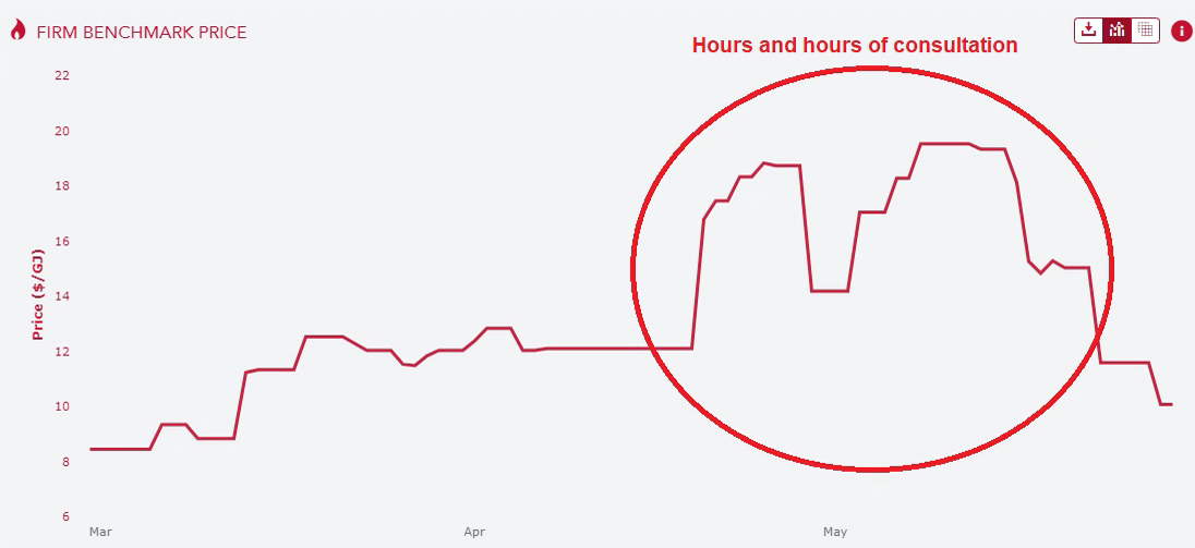 In short, we will have a fixed gas price of $12Gj interminably. This is 300-400%% above historical prices. As things stand, it will be cheaper to import gas from the US where you can buy it for $3.50Gj.