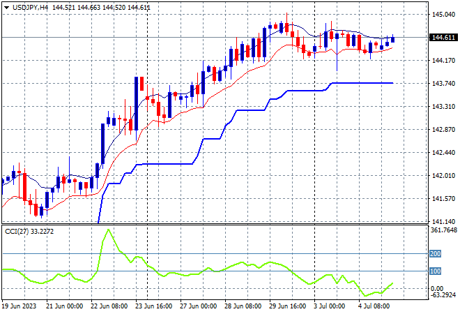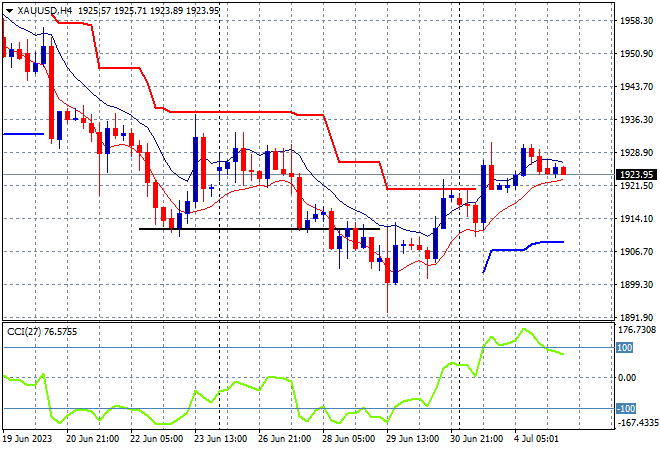 Oil prices are still not moving higher as expected given the OPEC/Ruzzia production cuts, with Brent crude hovering just below the $76USD per barrel level while gold is looking better but moving steady at just above the $1920USD per ounce level: