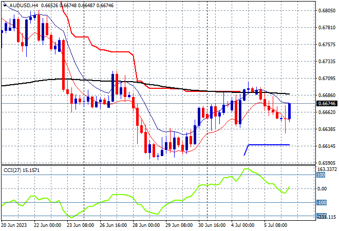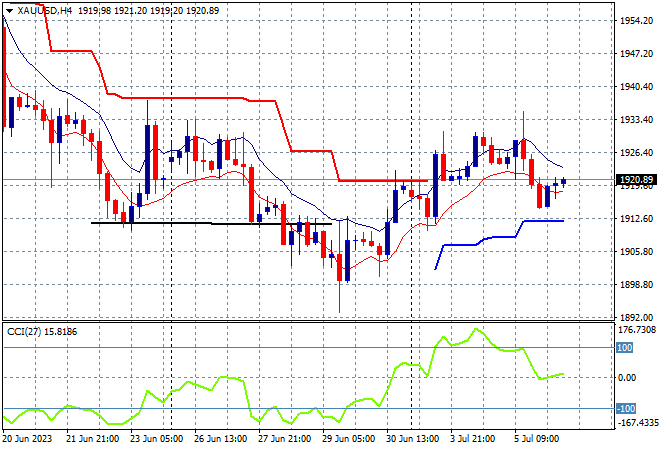 Oil prices are again inching higher on the OPEC/Ruzzia production cuts, with Brent crude hovering just below the $77USD per barrel level while gold is looking only slightly better after its overnight selloff, currently just above the $1920USD per ounce level: