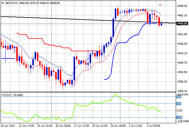 Eurostoxx and S&P futures are down 0.4 to 0.5% so far as the London session gets underway with the S&P500 four hourly chart showing price action rolling over after hitting resistance at the 4500 point level:
