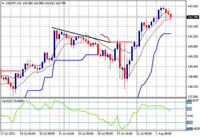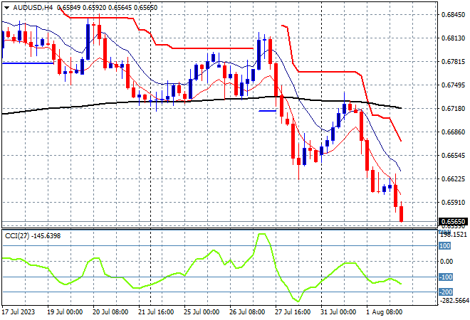 Asian stock markets are the first to react to the post close shock of the Fitch US downgrade with a broad selloff across the region and a run to safe havens. S&P futures are down considerably with European stocks not far behind with this catalyst a wakeup call before the all important US jobs print on Friday. The Australian dollar was pushed back the hardest, now down to the mid 65 cent level after yesterday’s RBA pause and other undollars remain under the pump of a strong King Dollar.