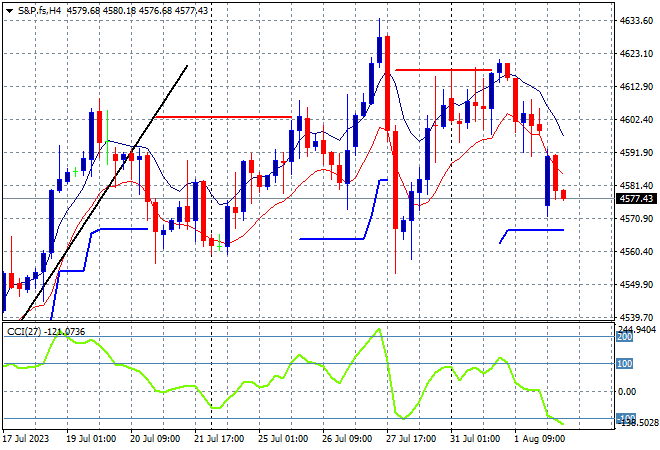 Eurostoxx and S&P futures are down about 0.8% as traders play catchup to the Fitch downgrade with the S&P500 four hourly chart showing a pullback down to last week’s session lows. The inability to get back above the 4600 point level before the NFP print on Friday could see a sharp rollover: