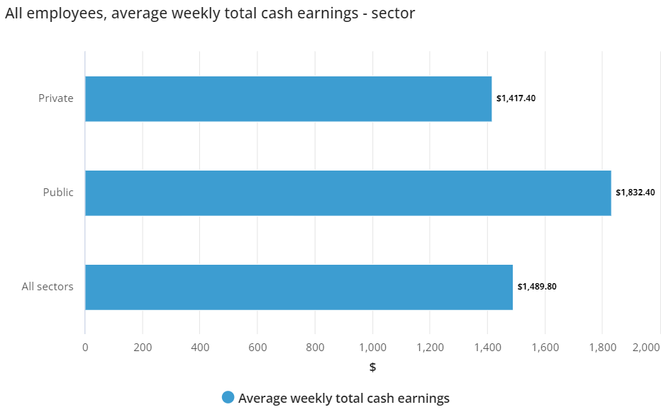 - Median weekly earnings were $1,300.00 for all employees, $1,509.00 for males and $1,130.00 for females.