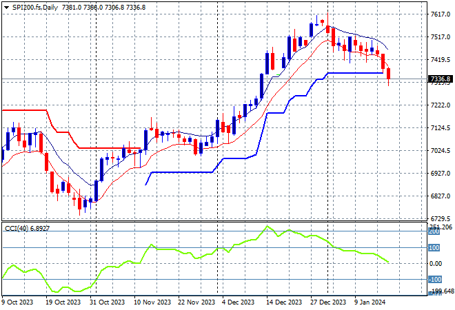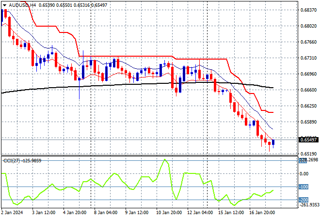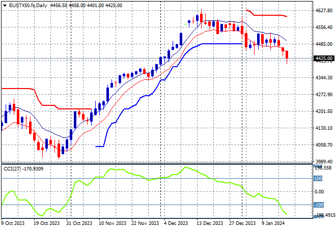 The weekly chart amply shows the significant downtrend from the start of 2023 with the 19000 point support level a distant memory as medium term price action remained stuck in the 17000 point range before this new losing streak. Daily momentum readings are back into oversold settings as price action returns to the October lows, with little chance of stabilising here: