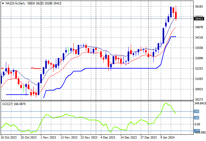 Japanese stock markets are in a two day retreat with the Nikkei 225 down nearly 0.4% to 35447 points.