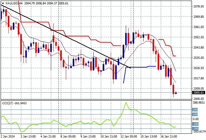 10 year Treasury yields lifted nearly 10 points to extend through the 4% level while oil prices were again relatively stable with Brent crude up marginally. Gold however couldn’t hold on to its recent breakout, continuing its breakdown to almost get below the $2000USD per ounce level.