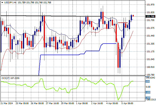 Mainland and offshore Chinese share markets are having a mixed start to the week with the Shanghai Composite down 0.2% while the Hang Seng Index is off by just 0.1% to 16709 points. Japanese stock markets however went the other day on a weaker Yen as the Nikkei 225 closed 0.7% higher at 39285 points with the USDJPY pair getting back on track to the recent weekly highs: