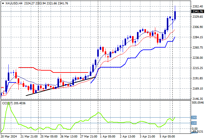 Oil prices have gapped down over the weekend on macro concerns in the Middle East with Brent crude still well above previous weekly resistance, but falling below the $90USD per barrel level while gold is still going straight up, currently at the $2340USD per ounce level: