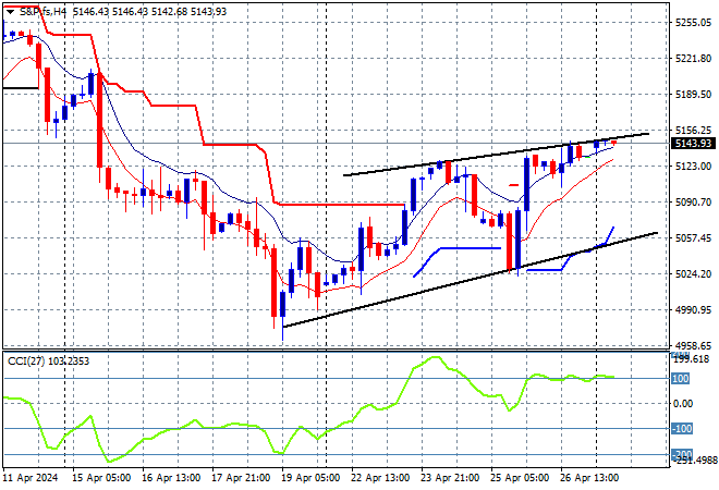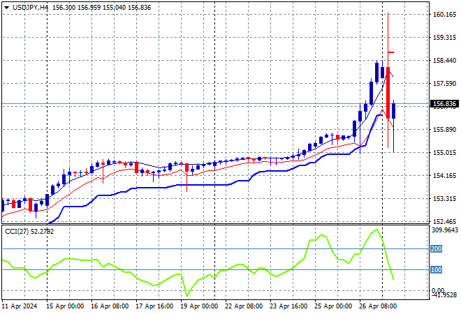 Mainland and offshore Chinese share markets are heading in the same direction with the Shanghai Composite up more than 0.7% to remain above the 3100 point level while the Hang Seng Index has lifted nearly 0.9% going into the close at 17814 points. Japanese stock markets were closed for a holiday while the USDJPY pair briefly touched the 160 level before smacked back to a more realistic level: