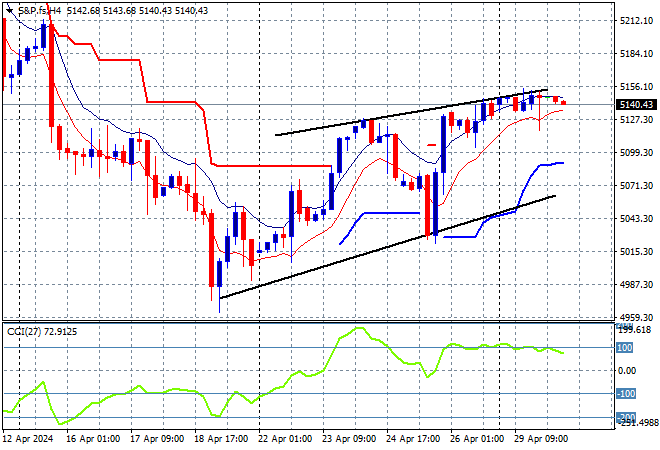 S&P and Eurostoxx futures are meandering along as we head into the London session with the S&P500 four hourly chart showing price action now out its small correction, possibly finding some resistance however at the 5150 point zone: