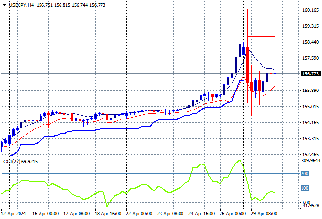 Mainland and offshore Chinese share markets are heading somewhat in the same direction with the Shanghai Composite down a handful of points while the Hang Seng Index has lifted barely at all, going into the close at 17762 points. Japanese stock markets reopened from their long weekend with the Nikkei 225 lifting more than 1% while the USDJPY pair is trying hard to normalise post its recent high volatility as it returns to a more sustainable 156 level:
