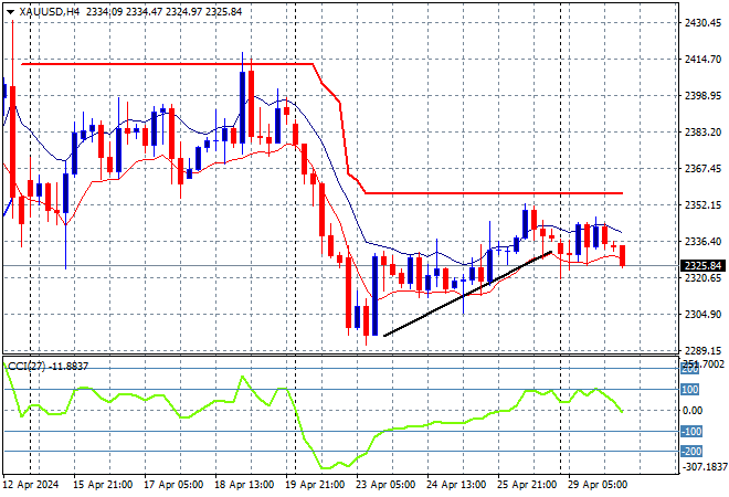 Oil prices are slipping further following the weekend gap down with Brent crude down to the $87USD per barrel level while gold is still struggling to recover from its recent rough retracement, heading below the $2330USD per ounce level this afternoon: