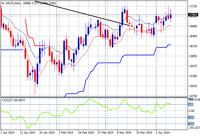 The Hang Seng Index daily chart was starting to look more optimistic with price action bunching up at the 16000 point level before breaking out in the previous session as it tried to make a run for the end of 2023 highs at 17000 points with the downtrend line broken. However this has been thwarted as monthly resistance levels are kicking in, although support is firming at the 16400 point area: