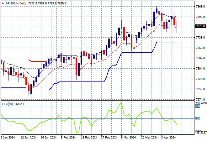 SPI futures are down again, off by 0.4% despite a late rebound on Wall Street overnight. The daily chart was looking firmer with the medium term uptrend and short term price action coming together to take out the previous December highs. As I said previously, watching for any continued dip below the low moving average could see a significant pullback but watch ATR support which has been defended so far:
