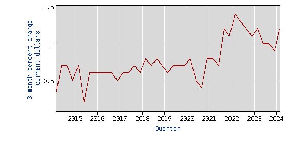 Compensation costs for civilian workers increased 1.2 percent, seasonally adjusted, for the 3-month period ending in March 2024, the U.S. Bureau of Labor Statistics reported today. Wages and salaries increased 1.1 percent and benefit costs increased 1.1 percent from December 2023. (See tables A, 1, 2, and 3.) Compensation costs for civilian workers increased 4.2 percent for the 12-month period ending in March 2024 and increased 4.8 percent in March 2023.