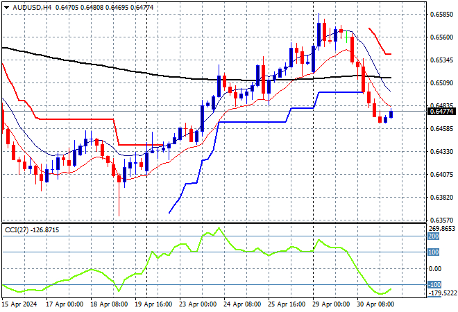 Mainland and offshore Chinese share markets are again looking listless with the Shanghai Composite down 0.3% while the Hang Seng Index has lifted just 0.1% to close at 17762 points. Japanese stock markets slipped back again with the Nikkei 225 down 0.31% while the USDJPY pair is trying hard to normalise with a steady lift to almost get through the 158 level: