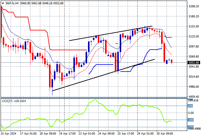 S&P and Eurostoxx futures are barely holding on as we head into the London session with the S&P500 four hourly chart showing price action at the lower end of its recent range after last night’s correction, with the 5000 point level coming under threat next: