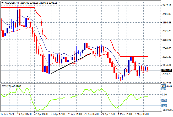 Oil prices are trying to stabilise after their recent sharp falls with Brent crude starting just below the $84USD per barrel level while gold is continuing its struggle, steady right on the $2300USD per ounce level this afternoon: