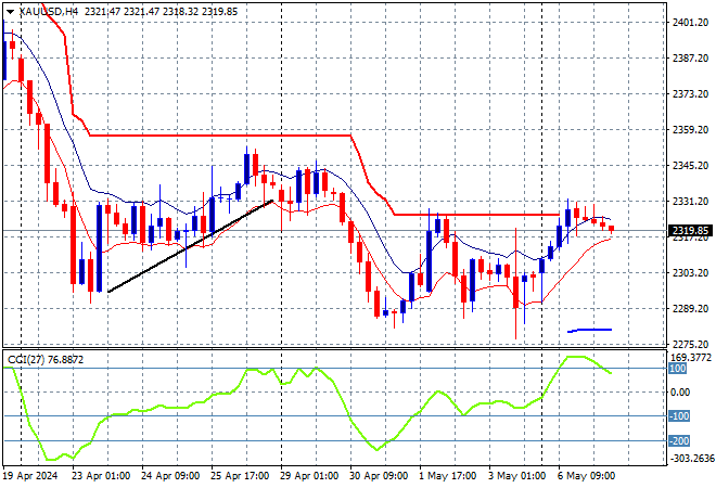 Oil prices are trying to stabilise after their recent sharp falls but remain under pressure with Brent crude starting just below the $84USD per barrel level while gold is continuing its struggle, steady above the $2300USD per ounce level this afternoon: