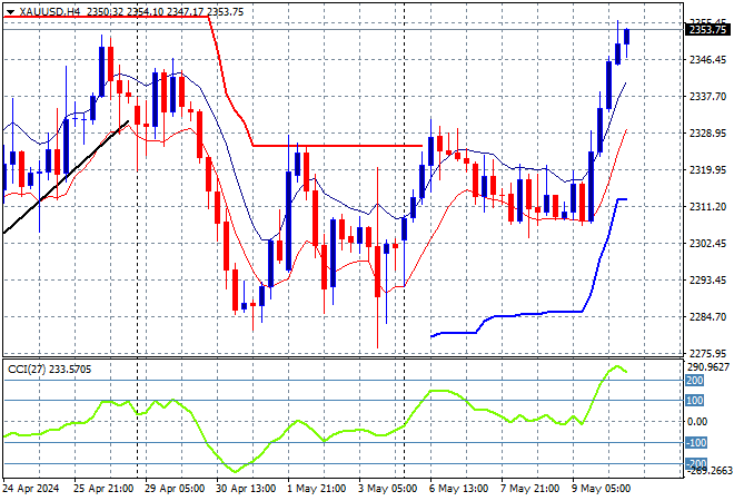 Oil prices are trying to stabilise after their recent sharp falls with Brent crude holding just above the $84USD per barrel level while gold is now above its April highs after last night’s breakout on the weaker USD, currently at the $2350USD per ounce level this afternoon: