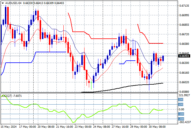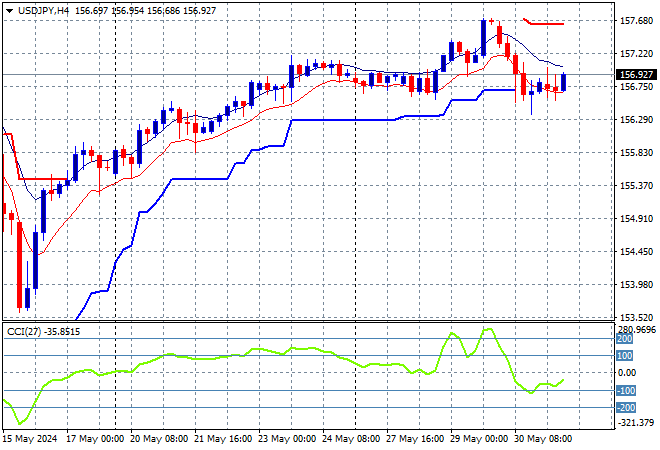 Mainland Chinese share markets were again up initially but are moving nowhere near the close with the Shanghai Composite basically unchanged while the Hang Seng Index is up slightly, closing 0.2% higher at 18271 points. Meanwhile Japanese stock markets are rebounding with the Nikkei 225 up more than 1.1% to 38487 points as the USDJPY pair steadied after falling below the 157 level: