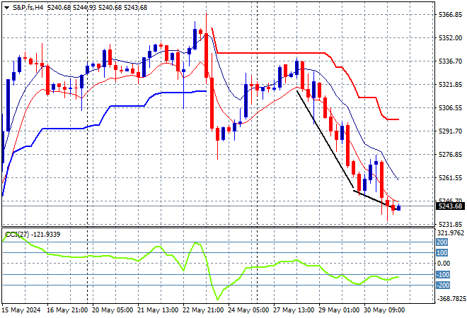 S&P and Eurostoxx futures are both up very slightly as we head into the London session. The S&P500 four hourly chart shows price action having broken well below the 5300 point level which has turned into short term resistance but momentum is starting to slow on the downside: