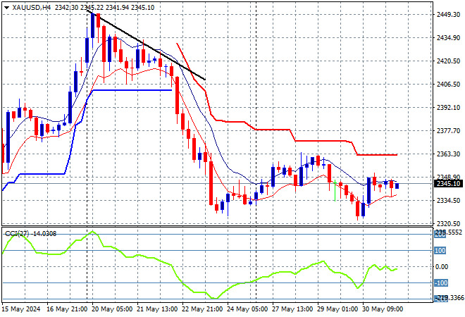 Oil prices are slipping again as Brent crude opens just below the $82USD per barrel level while gold is also trying hard to steady itself but is barely moving above the $2340USD per ounce level this afternoon: