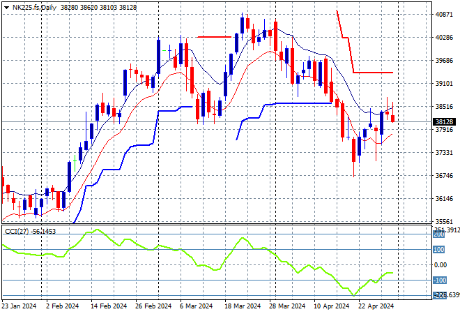 Price action had been indicating a rounding top on the daily chart with daily momentum retracing away from overbought readings with the breakout last month above the 40000 point level almost in full remission. Short term resistance has been defended with short term price action now retracing to support at the 39000 point level. Watch the 38000 level for signs of a true breakdown: