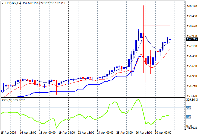 The USDJPY pair is defying the odds, rising again in steady fashion after some BOJ intervention that sent it across a 600 pip range post last week’s meeting. Overnight saw it move again above the 157 handle and almost back to the rocket high highs although momentum is now only slightly overcooked, setting up for further gains: