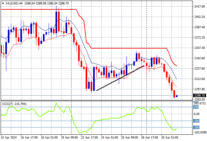 Gold failed to get back on trend after the minor retracement earlier in the month with the failed breakout above the $2400USD per ounce level turning into a correction and now a complete rollover down through the $2300 level overnight.