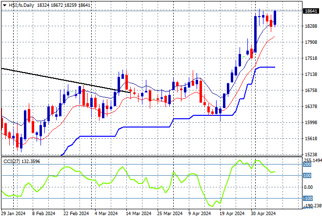 The Hang Seng Index daily chart was starting to look more optimistic with price action bunching up at the 16000 point level before breaking out in the previous session as it tried to make a run for the end of 2023 highs at 17000 points with the downtrend line broken. Price action looks way overextended without any retracement to take heat out of the market, but futures look very optimistic indeed: