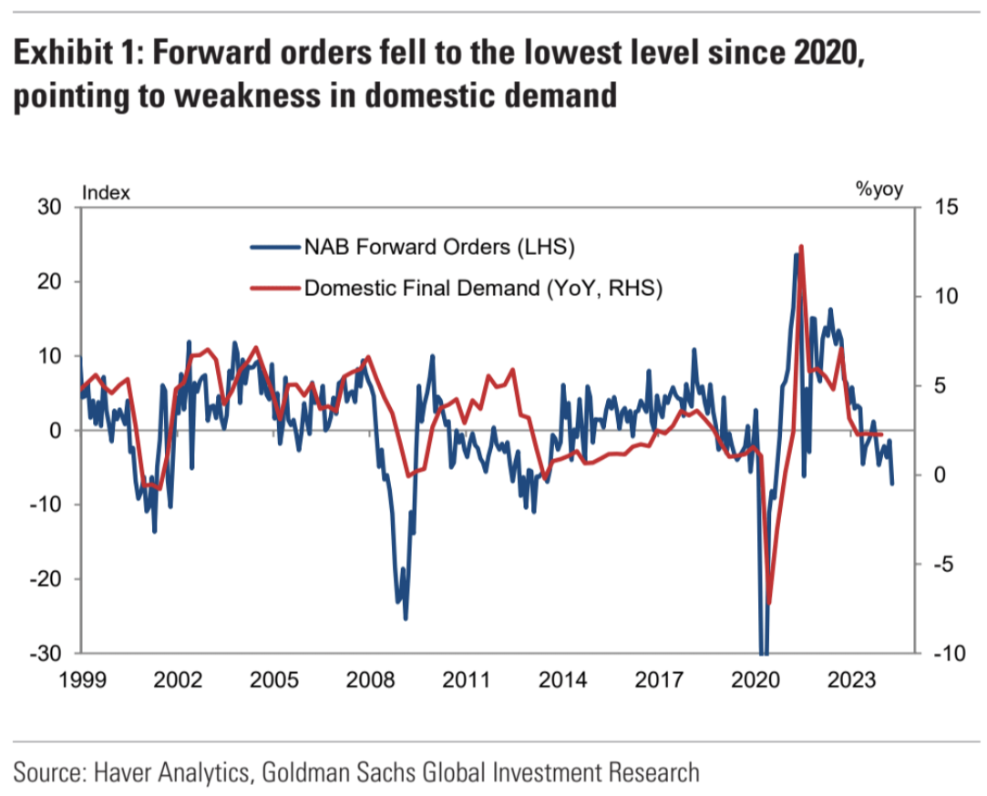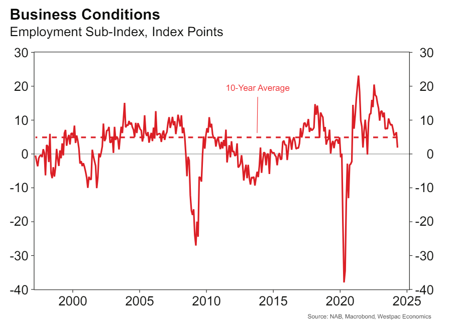 However, the employment sub-component fell 5 points to +2 index points, the lowest level in over two years and the first time this measure has fallen below the 10-year average since January 2022: